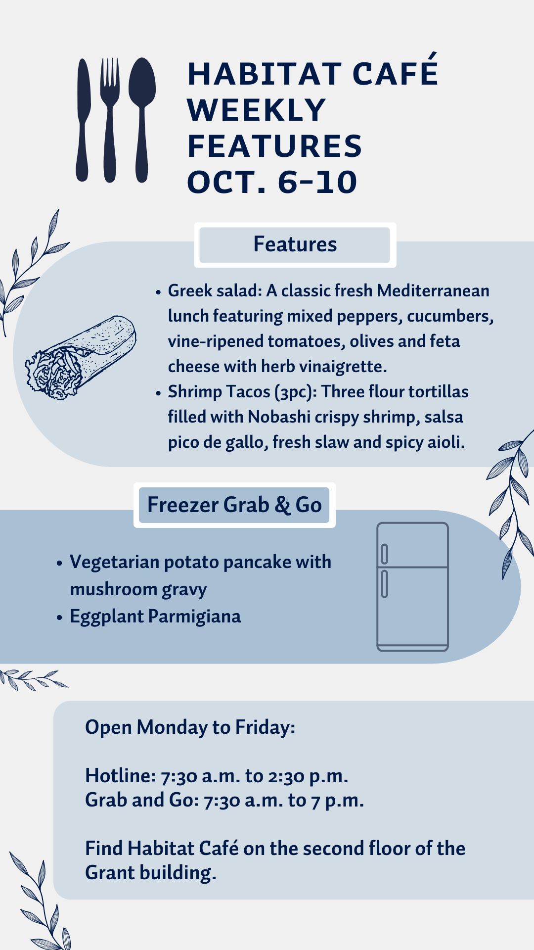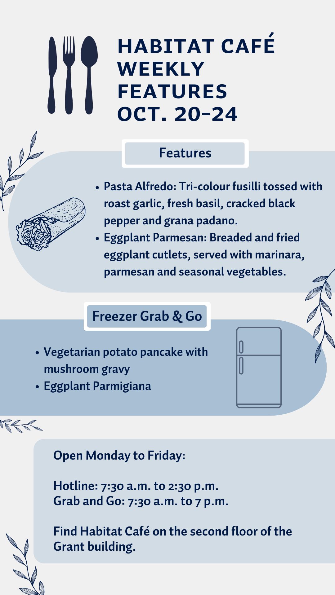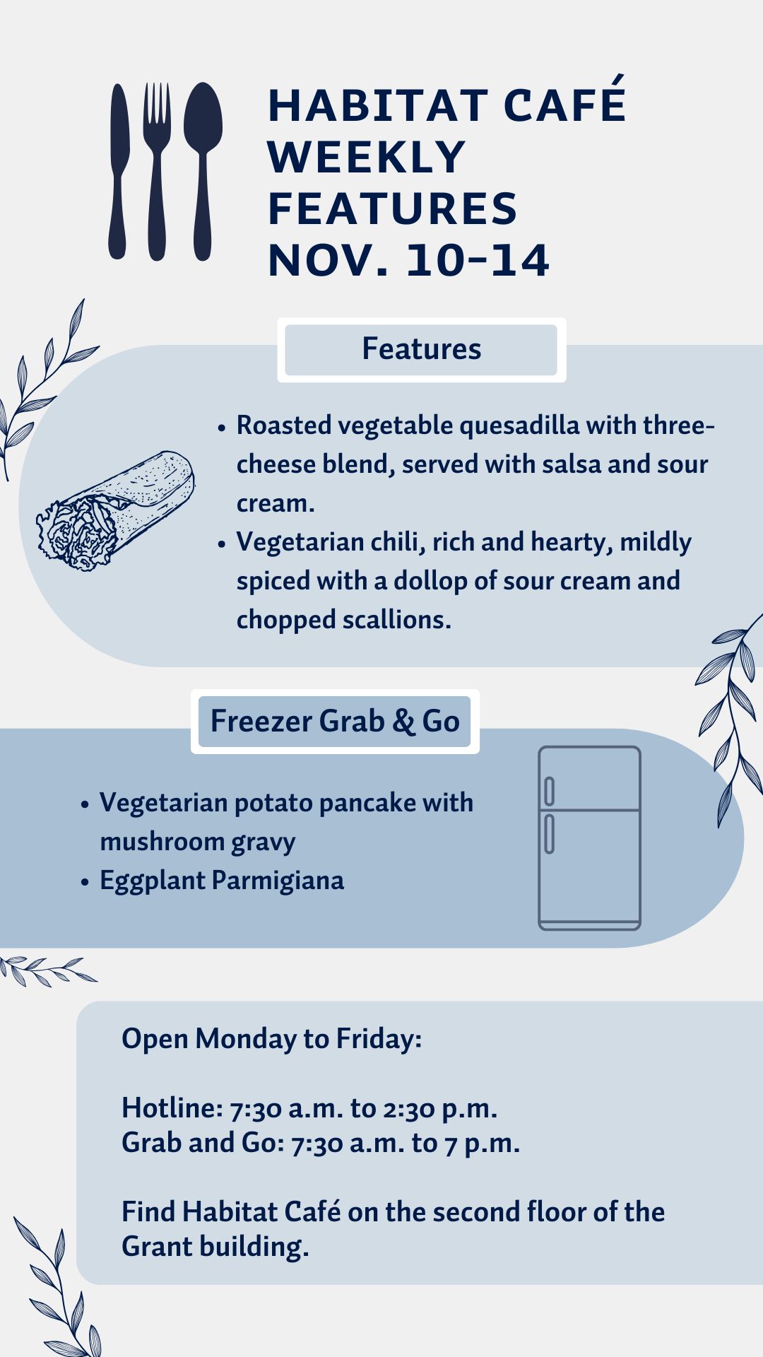 Find the Habitat Café on the second floor of the Grant building. See the Campus Map.