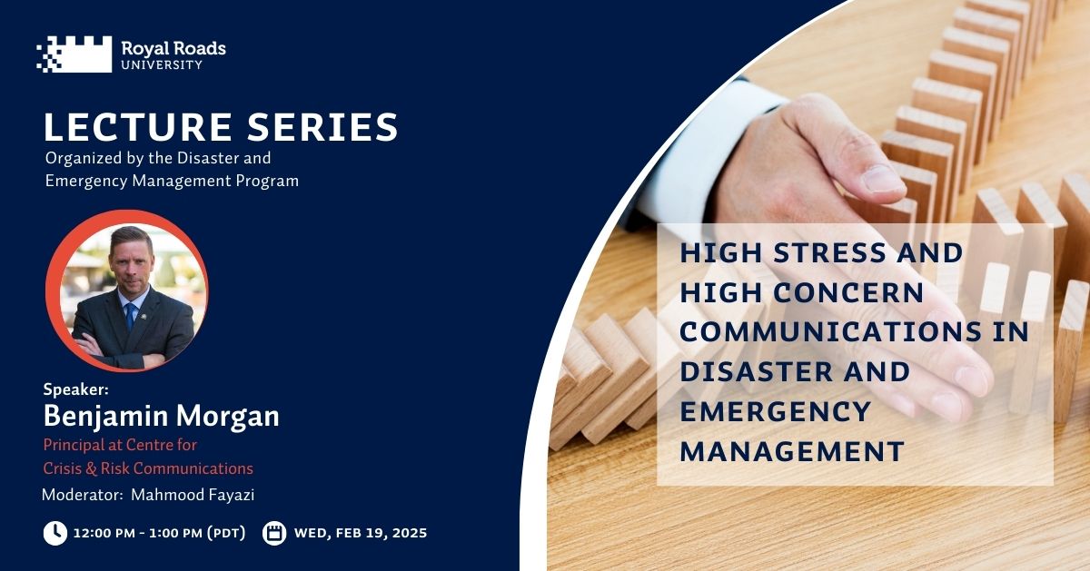 Join us Feb. 19 at noon for an engaging and informative session with one of Canada's leading crisis and risk communication practitioners, Benjamin Morgan, moderated by Mahmood Fayazi, assistant professor and program head of Royal Roads University's Disaster and Emergency Management Program. In this session, Morgan will explore core science-based theories and principles that underpin effective communication in high-stress, high-concern environments.