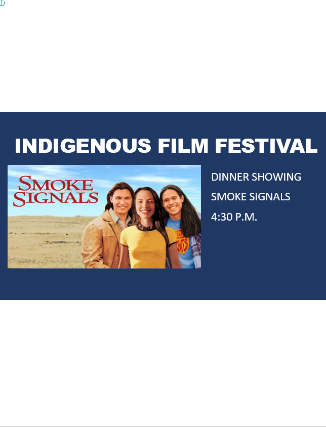 Smoke Signals will be shown at 4:30 p.m. A dinner option of pizza and bannock will be available. Space for discussion and debrief of the films will follow.