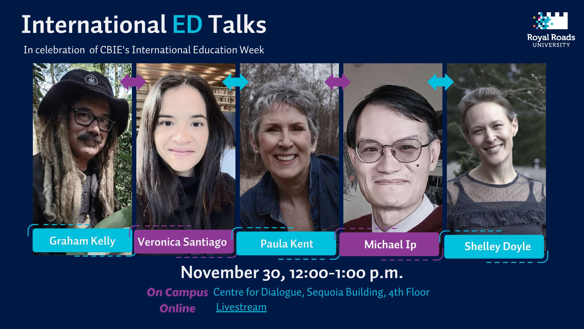 Please Show Your Support for International Ed Talks! In celebration of CBIE’s International Education Week, Student Engagement presents International ED Talks, hosted by MGM student Omolola Sadiq-abu. These talks aim to ignite discussion about the profound impact and reach of international education. Royal Roads students will share their experiences and insights through five thought-provoking presentations. Join us on-campus or livestream!
