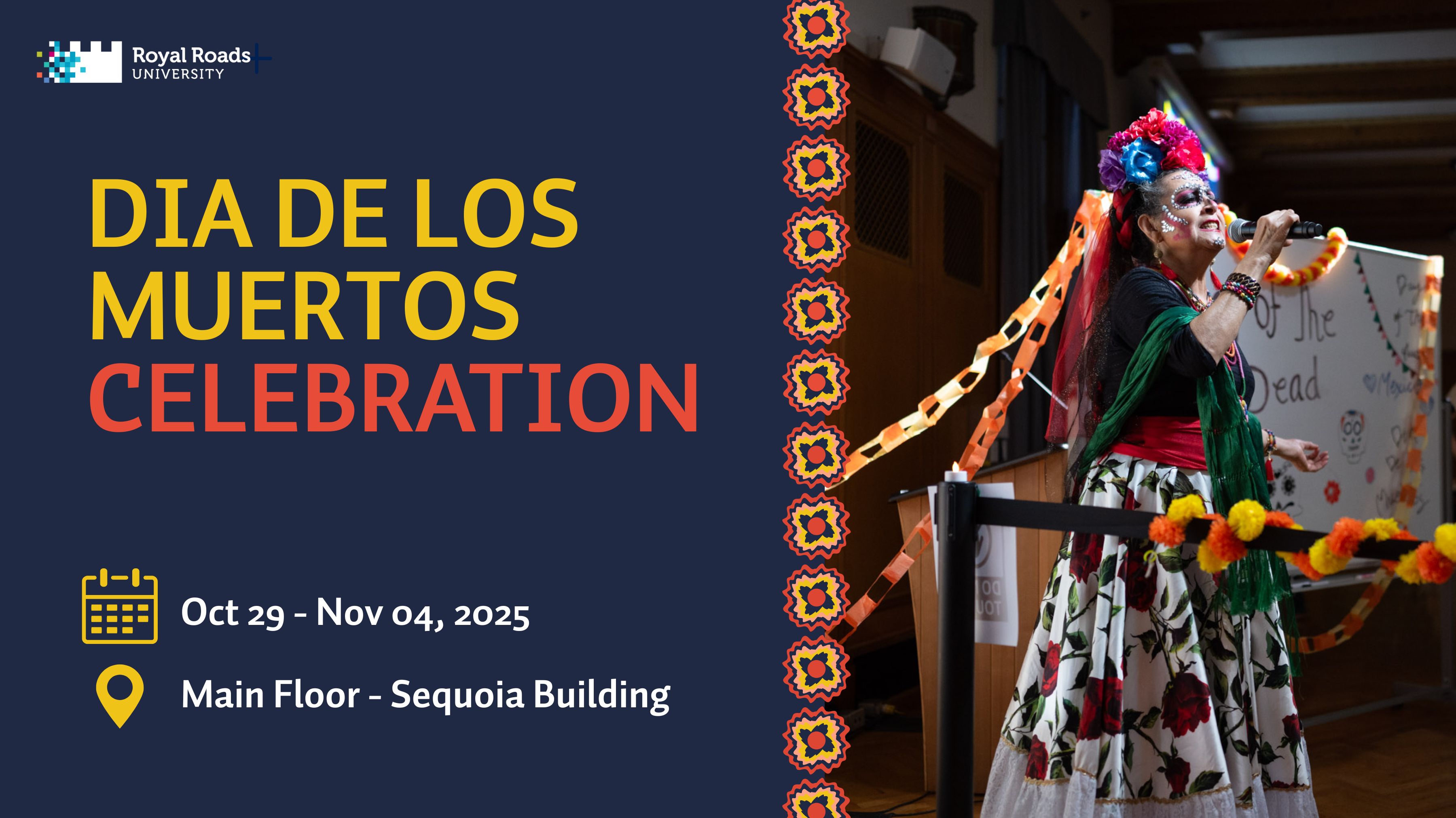 Experience the tradition of Día de Muertos at Royal Roads University as we honor life, memory, and culture through color, food, and stories. All students are invited to join this cultural celebration and learn about the meaning behind this beautiful Mexican tradition.