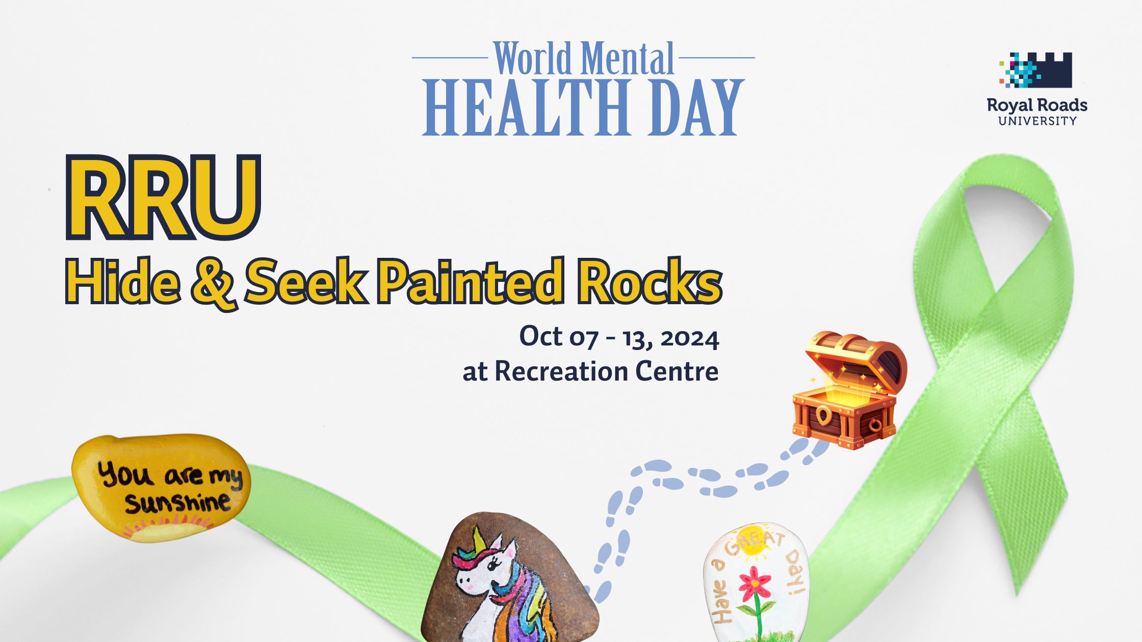Join us for an exciting and meaningful activity at the Royal Roads University Recreation Centre from October 7 to October 13! In collaboration with the Student Engagement Team and Counselling & Learning Strategy, we’re hosting the "RRU Hide & Seek Painted Rocks" event across the beautiful RRU campus, with a focus on promoting mental health and well-being.