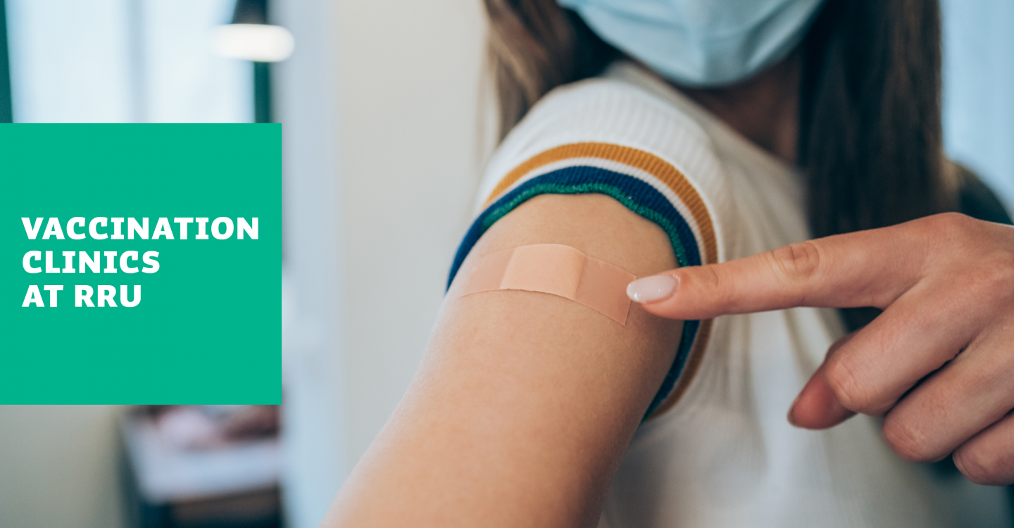 A student points to a post-vaccination bandage on her shoulder. The text reads: Vaccination Clinics at RRU.