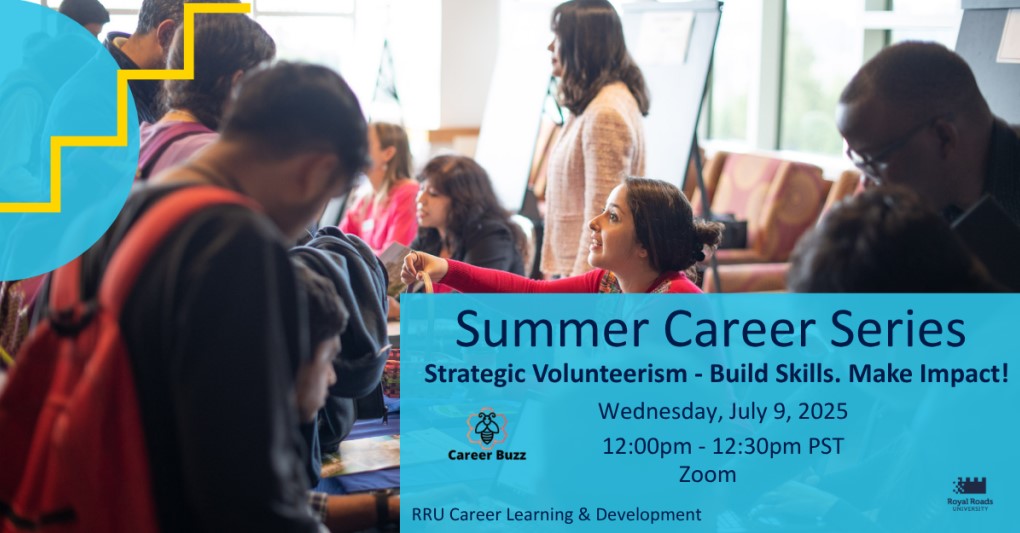 In this session on Strategic Volunteerism, learn how volunteering can be a powerful tool to advance your career. In this 20-minute session, we’ll explore how strategic volunteering can help you build transferable skills, expand your network, and gain meaningful experience that aligns with your goals. You will also get a guided overview of Royal Roads University’s self-paced online course, Strategic Volunteering, which offers practical tools to help you volunteer with intention and impact.
