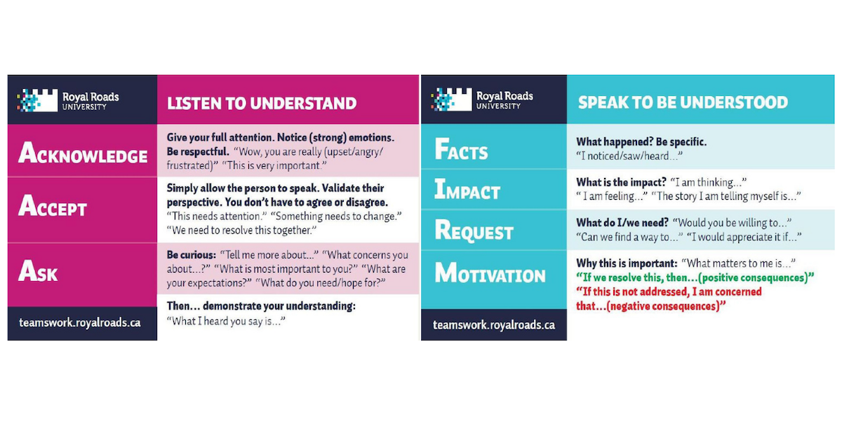 • Acknowledge — give someone your full attention, notice their emotions, be respectful;