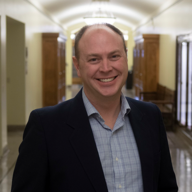 A man in a blue collared shirt smiles. A cherub statue is visible in the background.