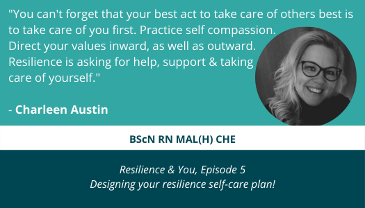 How do we say yes to self-care during a pandemic? Find out in this week’s resilience conversation. I had the pleasure of talking to my special guest Charleen Austin. This is your opportunity to hear from a health leader who had first hand experience in the healthcare system as a patient during COVID. From self reflection, values assessment, practicing self compassion, Charleen shares her strategies for self care and leading from a base of values to honour humanity, compassion and love. Be sure to listen in to learn more.