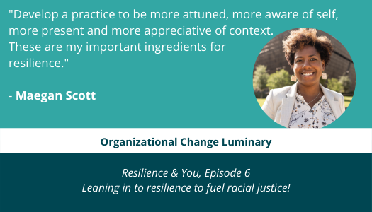 Resilience & You, Episode 6: Leaning in to resilience to fuel racial justice with guest Maegan Scott is now available.