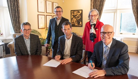 See Photograph: On behalf of RRU: President Philip Steenkamp, VP Academic & Provost Dr. Steve Grundy and Dr. Leslie King, Professor (SES) & Director, Canadian Centre for Environmental Education and on behalf of ECO Canada: Kevin Nilsson, President and Ben Keizer, Vice President of Finance and Operations. Photo taken by Dan Anthon.